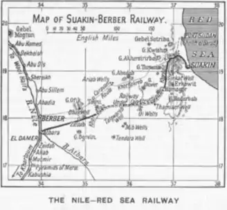The Suakin-Berber railway on the Red Sea coastal region in Sudan was a short-lived military project that never reached completion. Its construction began in February 1885, being intended to provide a connection between Berber on the River Nile and Suakin on the Red Sea littoral for the rapid deployment of troops and military equipment in Britain’s involvement in the Mahdist war.