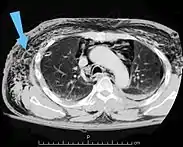 Significant cases of subcutaneous emphysema are easy to diagnose because of the characteristic signs of the condition.[1] In some cases, the signs are subtle, making diagnosis more difficult.[13] Medical imaging is used to diagnose the condition or confirm a diagnosis made using clinical signs. On a chest radiograph, subcutaneous emphysema may be seen as radiolucent striations in the pattern expected from the pectoralis major muscle group. Air in the subcutaneous tissues may interfere with radiography of the chest, potentially obscuring serious conditions such as pneumothorax.[18] It can also reduce the effectiveness of chest ultrasound.[27] On the other hand, since subcutaneous emphysema may become apparent in chest X-rays before a pneumothorax does, its presence may be used to infer that of the latter injury.[13] Subcutaneous emphysema can also be seen in CT scans, with the air pockets appearing as dark areas. CT scanning is so sensitive that it commonly makes it possible to find the exact spot from which air is entering the soft tissues.[13] In 1994, M.T. Macklin and C.C. Macklin published further insights into the pathophysiology of spontaneous Macklin's Syndrome occurring from a severe asthmatic attack.