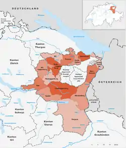 The Canton of St. Gallen until 2002 was divided into 14 districts (German: Bezirke). On 1 January 2003 they were abolished and the canton was divided into 8 constituencies (German: Wahlkreise).