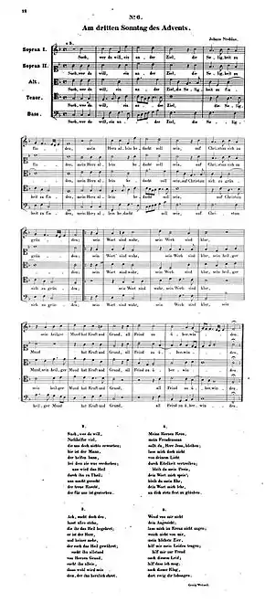 The earliest extant print of Such, wer da will is a five-part motet by Stobäus in a collection Preußische Festlieder (Prussian festive hymns) that Stobäus published in 1642, of his works and those of his teacher Johannes Eccard.[2] The song was included in several hymnals.[3] In the current German Protestan hymnal Evangelisches Gesangbuch as EG 346.