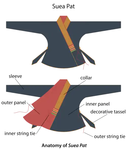 Basic components of the suea pat include a collar, front panels, back panels, sleeves, and tie strings. There are tassels at the side of the garment, though not always present. Modern versions typically of Lao design may use fasteners or buttons in lieu of strings. The collar can be done with intricate goldwork or be left plain. A cuff matching the collar is sometimes present and the sleeves can be full or three-quarters length.