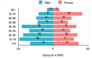 According to the 2002 Poland census, there were 312 people residing in Sufczyce village, of whom 52.6% were male and 47.4% were female. In the village, the population was spread out, with 25.3% under the age of 18, 35.3% from 18 to 44, 17.3% from 45 to 64, and 21.2% who were 65 years of age or older.[1]
