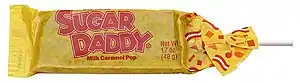 Sugar Daddy is a candy bar on a stick manufactured by Tootsie Roll Industries that is essentially a block of moderately hard caramel. A bite-sized caramel-flavored jelly bean candy based on the Sugar Daddy is marketed under the name Sugar Babies.