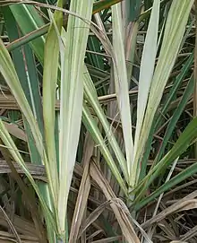Symptoms of iron deficiency (interveinal chlorosis) are very similar to those of SCGS. It shows creamy leaves, but no chlorosis occurs in leaf veins, and they remain green. In the case of severe iron deficiency, veins may lose chlorophyll in the absence of iron and appear similar to SCGS disease.[22][23] Iron deficiency is caused by a lack of iron nutrients in the soil; therefore, one may observe several plants showing symptoms of iron deficiency in localized patches in a field. Phytoplasma-infected plants, though, may occur anywhere in the field in a more random distribution. Treatment with 0.1% ferrous sulfate, either by spraying or supplying it through fertilizer cures iron deficiency, but phytoplasma-infected sugarcane does not respond to any treatment. Phytoplasma-infected plants growing in vitro show sensitivity to tetracycline.[22][23]