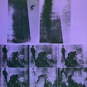 Suicide (Purple Jumping Man) depicts two images in sequence, recorded by a documentary photographer, silk-screened in black ink on a purple ground.[5]