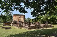 Wat Phra Phai Luang (Thai: วัดพระพายหลวง) was the ritual center of Sukhothai and the biggest temple in the city area. Built in the late 12th century during the reign of Jayavarman VII when the city was still under control of Khmer-Lavo. After the liberation and the construction of Wat Mahathat, Wat Phra Phai Luang lost it main ceremonial role and become Theravada Buddhist temple. Similar to Wat Si Sawai, the temple has three laterite prang, but only one still preserved in good condition. Archaeologists suspect that the three prangs originally stood on a common laterite base. All three prangs were open to the east, with doors flanked by columns which carry a richly decorated tympanum depicting scenes from the life of Buddha. The doors on the other three sides were so-called "false doors". The tympanum The complex is enclosed by double moat. The outer moat is 600 meters length and is fed by the Lam-Pan River. In the north-west of prang complex are the remains of late 14th century vihara, mandapa and a small ordination hall with eight Bai Sema. The temple is an important place to study the transition of Khmer art to Thai art. Since in the 14th century the prang has been renovated by adding elaborate stucco in leaves and frames patterns which become the basic pattern of Thai art; however, most of stucco arts are now kept at Ramkhamhaeng National Museum.[11]: 17–51