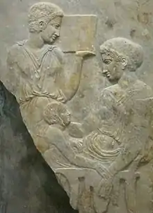 The front side of the tombstone features three sculptured human figures, apparently in a scene of bidding farewell to a dead woman. The woman, seated in an armchair, hugs with her right hand a grieving boy leaning against her knees. The background depicts a young girl in a girdled (belted) Attic peplos holding a small box, probably with funeral gifts to the dead person.[1][2]