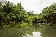 The location is surrounded by rice paddies and includes an extensive forest. Aside from natural attractions, including flora and fauna, the site includes a fishing pond, pools (for adults and children), a two-story cafe and restaurant, a reading center (holding some 500 books and journals), and a meeting hall.[2][3] Recreational activities include water sports and flying fox.[3]
