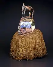 The hemba mask is exclusive to the Suku people. It is made from a cylindrical piece of wood carved into a helmet shape or bell shape, and is worked into a human face and coiffure and raffia fringe covers around the face. A superstructure is frequently present carved into a single animal and rarely a single human figure on top of the mask. The coiffure has triangular decoration bands on it and is painted black with some areas a dull red. The face is painted white and marked by blue lines that descend from the lowered eyelids, and sometimes define a brow or nose ridge. Ts danced at the initiation camps when charms are introduced and when mukhanda is closing and is worn by the just initiated during the end. The hemba mask also helps women with gynecoid illness and cures those suffering from a hernia. It also helps with bad luck when hunting, while they dance for a blessing from the elder-ancestor. It is said to hold the collective image of all elders.[3]