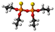 Sulfotep (also known as tetraethyldithiopyrophosphate and TEDP[7]) is a pesticide commonly used in greenhouses as a fumigant. The substance is also known as Dithione, Dithiophos, and many other names. Sulfotep has the molecular formula C8H20O5P2S2 and belongs to the organophosphate class of chemicals. It has a cholinergic effect, involving depression of the cholinesterase activity of the peripheral and central nervous system of insects.[5] The transduction of signals is disturbed at the synapses that make use of acetylcholine. Sulfotep is a mobile oil that is pale yellow-colored and smells like garlic.[7][8] It is primarily used as an insecticide.
