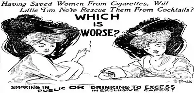 The Sullivan Ordinance was a municipal law passed on January 21, 1908, in New York City by the board of aldermen, barring the management of a public place from allowing women to smoke within their venue.[1] The ordinance did not bar women from smoking in general nor did the ordinance bar women from smoking in public, only public places. Right after the ordinance was enacted, on January 22, Katie Mulcahey, the only person cited for breaking this ordinance, was fined $5 for smoking in public and arrested for refusing to pay the fine; however, the ordinance itself did not mention fines nor does it ban women from smoking in public. She was released the next day.[2] The mayor at the time, George B. McClellan Jr., vetoed the ordinance two weeks later.[3]