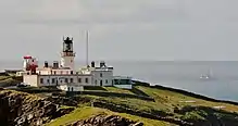 The lighthouse was built by Robert Stevenson in 1821 and is the oldest lighthouse in Shetland.[1] From 1906 until 1987 there was also an active foghorn,[2] which is traversable in azimuth. This replaced a fog bell which had been presented after the loss of the Royal Victoria in 1864. The bell now hangs in the parish church at Dunrossness.[2] The light was automated in 1991 and the keepers' houses were converted into holiday accommodation. The foghorn was restored in 2015 and sounds on special occasions. The lighthouse complex also has offices for the RSPB who look after the bird reserve which surrounds the lighthouse.