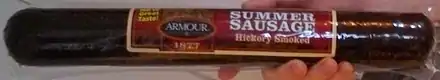 Summer sausage is an American term for any sausage that can be kept without refrigeration until opened. Summer sausage is usually a mixture of pork, but may be made of or contain other meats such as beef or venison. Summer sausage is fermented, and can be dried or smoked, and while curing ingredients vary significantly, curing salt is almost always used. Seasonings may include mustard seeds, black pepper, garlic salt, or sugar.[1][2]
