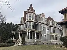 After the Italianate style, the next style to become widespread on Summit Avenue was the Queen Anne style.[23] Its name is misleading as although named “Queen Anne” it bore no real resemblance to early 18th-century British architecture. Instead, this style was fantastical in appearance featuring columns and pediments, peaked, high-pitched roofs, and profuse decorative elements such as dormer windows, gables, bays, porches, balconies, and turrets.[24] In addition, this style almost always includes a wrap-around porch and either a round or polygonal corner tower coming out of the spire-like roof.[25] Such houses were constructed using materials such as stone, slate, brick, wood, shingles, and half-timbering. Summit Avenue’s lost 1882 Barnum House once exhibited a transition from the aforementioned Italianate style to that of the newer Queen Anne. It featured characteristics of both styles such as typically Italianate porch detailing, windows and bracketing while also having a roof, balconies, and turrets that adhere more to the new style.[26] Summit Avenue contains many houses built in the purely Queen Anne style such as the castle-like red brick Driscoll House with its conical turret and high-pitched roof spotted with many dormers and chimneys.[27] The beautifully painted wooden “fairytale” residence at 513 Summit was also constructed in this style and features a large porch and a fanciful turret.[28] One of the best-preserved Queen Anne Style houses on the Avenue is the Shipman-Greve House at 445 Summit. This unique limestone house exhibits half-timbering and decorative Japanese-inspired latticework on the porch.[29] A variant of the Queen Anne style commonly known as the “Shingle Style” can be seen in Summit’s 1884 Noyes House. This Shingle Style was similar to the Queen Anne but was constructed with wood shingling on every surface, giving these buildings an irregular texture.