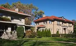 While other houses continued to draw inspiration from history a comparatively more modern style also took root on Summit Avenue, the Rectilinear Style. In this style, the architectural form moves away from previous irregular and fantastical forms and towards a more rectangular shape.[51] Houses of this style often feature elements such as overhanging eaves and casement windows but have little applied ornamentation and are relatively unpretentious when compared to other styles.[52] The Dittenhofer house at 705 Summit exhibits a move towards the Rectilinear style in its symmetry and blockish shape but cannot escape historicism in its medieval-inspired elements such as Gothic-like arched windows that were once fitted with stained glass.[53] The 1912 Beebe House in comparison is much simpler and thoroughly unpretentious in its appearance, looking almost insignificant compared to the other grand houses on the avenue. The Beebe House features no ornamentation but includes extended eaves and windows arranged in banked groups, elements also distinctive of the famous Prairie Style which was soon to become a variant of the Rectilinear.[54]