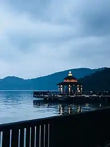 The lake and its surrounding countryside have been designated one of thirteen national scenic areas in Taiwan. Wen Wu Temple was built after rising water levels from building a dam forced several smaller temples to be removed.[9] Tzu-En Pagoda (慈恩塔; Cí'ēn Tǎ) was ordered constructed by late President Chiang Kai-shek in 1971 in memory of his mother.[10] Other temples of note include Jianjing Temple,[3] Syuentzang Temple[11] (玄奘寺; Xuánzàng Sì) and Syuanguang Temple[12] (玄光寺; Xuánguāng Sì).