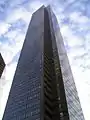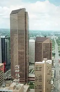 The Suncor Energy Centre,[5] formerly the Petro-Canada Centre, is a 181,000-square-metre (1,950,000 sq ft) project composed of two granite and reflective glass-clad office towers of 32 floors and 52 floors, situated in the office core of downtown Calgary, Alberta. The Council on Tall Buildings and Urban Habitat lists the west tower (215 m or 705 ft as measured to top of the structure), as the 19th tallest building in Canada and the fourth tallest skyscraper outside of Toronto.[4] The west tower overtook the Calgary Tower as the tallest free-standing structure in Calgary from its completion in 1984, until being surpassed by the neighbouring Bow in 2010.[6] The office towers encompass 158,000 m2 (1,700,000 sq ft) of rentable office space with the complex also containing 23,000 m2 (250,000 sq ft) of retail and underground parking area. A glass-enclosed walkway (part of the +15 System) provides shelter and easy access to the surrounding buildings.