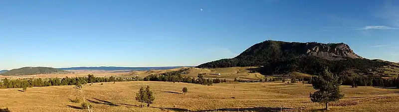 The town is directly south of the Bear Lodge Mountains, part of the Black Hills National Forest.