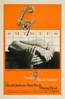 Sunday Bloody Sunday is a 1971 British drama film directed by John Schlesinger, written by Penelope Gilliatt, and starring Glenda Jackson, Peter Finch, Murray Head and Peggy Ashcroft. It tells the story of a free-spirited young bisexual artist (played by Head) and his simultaneous relationships with a divorced recruitment consultant (Jackson) and a gay Jewish doctor (Finch).[2]