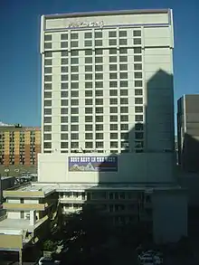 The 19-story tower was approved with casino space on the first four floors, hotel rooms on floors 5 through 10, and office space on the remaining floors.[26] At the end of 1978,[27][28] during construction of the tower, Karadanis had plumbing installed on the office floors, which he now intended to finish as part of the hotel. The city ordered construction to stop, as Karadanis did not have approval for the additional hotel rooms, and the added plumbing was a violation of the city's sewer allocation procedures. Work resumed in January 1979, after Karadanis had the plumbing removed.[26] Karadanis said, "At the time I didn't think putting the plumbing in was such a serious offense." Morris said that converting the "meager" office space into hotel rooms made more economic sense, as large office complexes were scheduled to open elsewhere in the city over the next few years.[29] Two months after work resumed, the Sundowner became the focus of a federal grand jury investigation into sewer allocation procedures being taken by the city.[30][31][32] The grand jury probe requested various documents and building plans related to the ongoing construction of the new tower.[33]