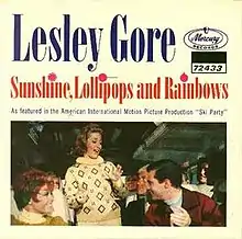 "Sunshine, Lollipops and Rainbows" is a popular song sung by Lesley Gore. It was originally released on Gore's 1963 album Lesley Gore Sings of Mixed-Up Hearts.[1] Composed by Marvin Hamlisch,[2] the single was released in conjunction with Gore's rendition in the 1965 film Ski Party.[3] It was arranged by Claus Ogerman and produced by Quincy Jones.[4][5] The tune peaked at #13 on the Billboard Hot 100.[2] Billboard said of the single that "back on the happy rhythm trail, Lesley comes up with a winner in this summertime rouser."[6] Cash Box described it as "an engaging lovey-dovey, a perfect way for teeners to get in the summertime spirit."[7]