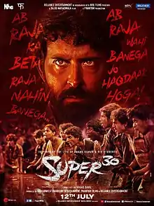 Super 30 is a 2019 Indian Hindi-language biographical drama film revolving around the story of mathematics teacher and educator Anand Kumar as well as his educational program of the same name. The film is jointly produced by Phantom Films, Nadiadwala Grandson Entertainment, Reliance Entertainment and HRX Films at a budget of ₹600 million.[1][2] Directed by Vikas Bahl, it is written by Sanjeev Dutta with music composed by Ajay–Atul.[3] The film stars Hrithik Roshan as Anand Kumar; Mrunal Thakur, Nandish Sandhu, Virendra Saxena, Pankaj Tripathi, Aditya Srivastava and Amit Sadh play supporting roles.[4][5] Super 30 marked the official Hindi film debuts of Thakur and Sandhu and the last production of Phantom Films.[6]