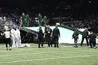 The challenge may come from working outside in the elements. It could be 50 degrees when we rehearse and 50 below on game day, we're working under the pretext that we can be doing this in snow or rain ... In a normal indoor environment we have seven minutes to install the stage and get it camera ready. That can be stretched to nine minutes. It's the same time frame for this.[21]
