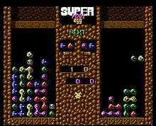Super Foul Egg is a clone of Puyo Puyo, where pairs of differently-coloured blocks (eggs in this case) drop from above, and the player has to manipulate them into the correct position by moving them left and right, or by rotating the pair. Eggs continue to fall until they rest on another egg. When four or more eggs of the same colour touch each other horizontally or vertically (not diagonally) they vanish, and one or more grey-coloured "foul eggs" drops onto the screen of the opposing player. Foul eggs don't make sets, so they only serve to fill up the screen and hasten a player's defeat. However, eggs that vanish also destroy any adjacent foul eggs. Creating combos whereby disappearing eggs cause a chain reaction in which other eggs fall and make matched sets greatly increases the number of foul eggs that fall on the opponent. The first player to have their screen filled up with un-matched eggs loses.