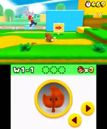 Super Mario 3D Land is a platform game that has been described by game designer Shigeru Miyamoto as a "3D Mario that plays as a 2D Mario game".[7] As such, Super Mario 3D Land combines the elements of traditional side-scrolling video game titles, such as linear-based levels, with those of the modern open world titles, such as moving Mario in three dimensions and performing a variety of actions.[7] Similar to the older side-scrolling Mario games, the health system revolves around Mario shrinking upon taking damage from enemies or hazards, there is a dedicated "Dash" button as opposed to using analog input to determine travel speed, and damage as "Small Mario" results in losing a life. Mario has also learned two new moves: a barrel roll and a roll jump, the former of which can be used to break blocks in a similar manner to jumping at blocks from below or ground pounding, and the latter allowing Mario to cover much horizontal ground in one jump. Super Mario 3D Land utilizes a similar level objective to the aforementioned side-scrolling games, in which the point of each level is to reach and grab the "Goal Pole" at the end of the level, within the time limit.[7][8]