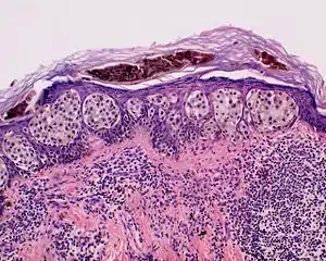 - Invasion of the upper epidermis in a pagetoid fashion (discohesive single cell growth).