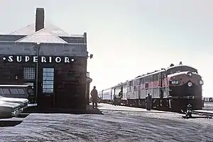 The Superior Union Depot or Superior station of Superior, Wisconsin was built in 1905, replacing a previous depot, which had burned down in 1904. It was built of Lake Superior brown sandstone and designed by Duluth architects German and Lignell. The depot primarily served the Great Northern Railway, Northern Pacific Railway and Duluth, South Shore and Atlantic Railway. Passenger service ceased upon the formation of Amtrak in 1971, but resumed between Minneapolis and Superior in 1975.[2] Wisconsin Governor Patrick Lucey spoke at the station dedication.[3] Superior was served by the Arrowhead and later the North Star between Chicago and Duluth.[2] Service ceased in 1984.[4] The depot continues to exist as a business.