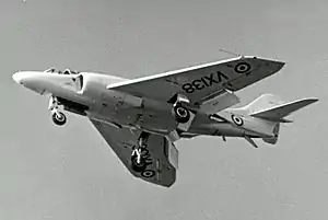 The aircraft made further test flights during late 1954 from its base at Chilbolton airfield, Hampshire. In early 1955 it was taken by road to the Hursley Park factory for the installation of a flap blowing system.[5] This was designed to reduce the safe landing approach speed, an obvious advantage for safe operation from aircraft carriers. It also lowered the speed at which catapult launches would be carried out.[6]