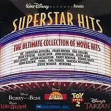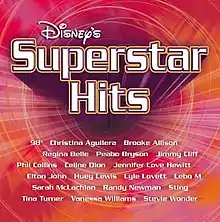 Superstar Hits is a compilation album released in 2002[1] & later re-released in 2004[2] with new songs for tracks 12–16 by Walt Disney Records. It features covers of songs from popular Disney movies by mainstream artists like Celine Dion, Tina Turner, and Christina Aguilera.