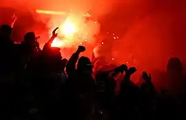 The supporters of Benfica, who are called benfiquistas, have played an important part in the club's growth during its 118-year existence. One of those cases was in the early days of the construction of the original Estádio da Luz, when club president Joaquim Ferreira Bogalho asked them for free concrete to build the stadium. They responded by offering 900,000 tons.[2] During the Portuguese Estado Novo, the Censorship Services prohibited newspapers from referring to the football team as Vermelhos (Reds) so it was not confused with communism, instead being referred as Encarnados (Flesh-coloured), which is still used, even after the transition to democracy.[3][4]