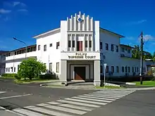 The Supreme Court of Palau is the highest court of Palau. Article X of the Constitution vests the Supreme Court with judicial power and provides for its operation and jurisdiction.[1] The Supreme Court is divided into a Trial Division and an Appellate Division. Cases are adjudicated by a single justice in the Trial Division and appeals are heard by panels of three different justices in the Appellate Division. The Trial Division of the Supreme Court has jurisdiction over all civil matters over $10,000 and criminal matters not assigned to the Court of Common Pleas and adjudication of land interests. The Supreme Court also handles disciplinary and other special proceedings. The Supreme Court consists of an Appellate and Trial Divisions. Chief Justice, Oldiais Ngiraikelau, and Associate Justices John K. Rechucher and Gregory Dolin are currently serving in the former division, while Presiding Justice, Kathleen M. Salii and Associate Justice Lourdes F. Materne serve in the latter one. Other judges are invited to sit on an as-needed basis as Associate Justices Pro Tem or Part-Time Associate Justices.[2]