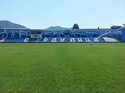 Stadium exists from 1955 and from the beginning serves as a home ground of FK Radnik Surdulica. In 1987 the southern stand was created. In 2015 FK Radnik was promoted for the first time in its history to Serbian Superliga and in the summer of 2015 stadium was modernized and expanded; new stands on east, north and west were erected, as well as floodlight masts.[1][2][3][4] Renovation works costs around 40 million dinars and expanded stadium's capacity to 3,312 seats.[5]
