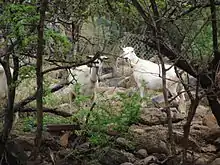 Goats from the Surfing Goat Dairy, Prosopis pallida is the shrub by them