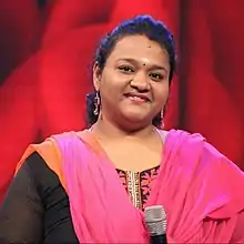 She is also a live stage performer who has performed more than 2000 orchestras.[19][20] She has sung in concerts in India[21] and abroad with the leading playback singers including S. P. Balasubramaniam, Mano, Hariharan, K. J. Yesudas, Chithra, Sujatha, Karthik, Srinivas, and with music directors Ilayaraja, Bharadwaj and Dhina. She has performed various star shows throughout India, Australia, Botswana, Canada, Europe, Germany, Malaysia, Middle Eastern Countries, Norway, Singapore, Sri Lanka,[22] Switzerland, the United Kingdom, and the United States of America.[23] She is regularly performing in Ilayaraja Shows for past 3 years.[24] She has also sung the title tracks for few Tamil and Telugu serials including Mahalakshmi (TV series) and Bama Rukmani.
