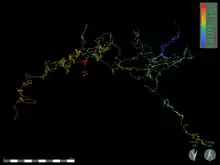 Centreline data is entered using plain text files, which are processed by 'Cavern'. The text files contain a hierarchy of cave surveys, each of which consists of a list of survey legs, which join survey stations. This program calculates the real world coordinates of survey stations, taking into account loop closure errors using least-squares minimization.[2] This processed data can then be visualised using a GUI front end called Aven. Survex has no arbitrary limits, and so is particularly good for large complicated cave systems, or areas where you need to see the relationships between multiple cave systems.