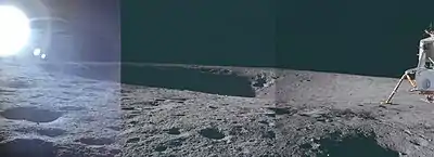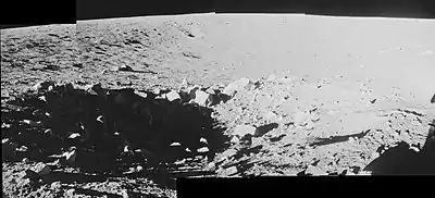 The Apollo 12 astronauts Pete Conrad and Alan Bean landed the Lunar Module (LM) Intrepid north of Surveyor crater on November 24, 1969. During the descent, Surveyor crater was a major landmark. Surveyor is the largest crater at the landing site. To the west of Surveyor is Head crater. To the southwest are Bench crater and Sharp crater (now called Sharp-Apollo). To the south is Halo crater. A distinct crater on the northeast rim is called Block crater.