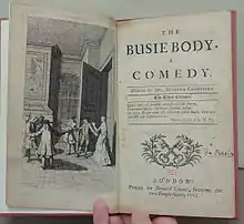 Centlivre was a highly successful professional playwright. A similarly renowned playwright, Colley Cibber, was accused of borrowing parts of Love at a Venture to write his own play, The Double Gallant. However, in an apparent reconciliation he accepted a part in Centlivre's next play, The Platonick Lady (November 1706).[23] After having grown weary with anonymous authorship, Centlivre used the preface to The Platonick Lady to express her distaste for society's outlook on the female writer.[4] Following her third marriage, Centlivre took some time off. This decision turned out to be a good one; her time away resulted in her most successful comedy, The Busie Body (May 1709).[24] The play ran for thirteen nights, a remarkable run for the time, and was revived the following season.[4]