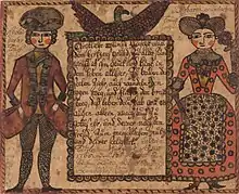 Several dozen drawings, mainly baptismal greetings, have been identified as being by this artist, whose name comes from a depiction of George and Martha Washington in the collection of Arthur Sussel. The artist is considered among the most important among the Pennsylvania Germans, and much has been gleaned from the drawings which he, or she, left behind. Texts included in the artist's pieces are the same as those used in European Goettlebriefe, which are souvenirs of baptism given to the child by its sponsors. The imagery of the pictures is unique in American fraktur, including such things as women in "bee-bonnet"-type hats. Relatively few works by the artist are known, but they have been found all over Pennsylvania, with examples known from Berks, Lebanon, Dauphin, Lancaster, York, and Schuylkill Counties. They speak to an artist who traveled a great deal, a fact which has hampered the process of identification; a similar case is that of the Ehre Vater Artist. None of the artist's surviving work is signed or initialed. Surviving images, besides baptismal records, include drawings for animals and of children, and images of people on horseback, including depictions of the Washingtons, the Princess of Sudbury, and Adam and Eve; these pieces are especially fine in their execution. Some images include birds carrying cherries; another includes a possible depiction of wallpaper in the background. Sources of the artist's designs are unknown, but the work of Johann Conrad Gilbert suggests their influence. Examples of work by the artist survive in which the outlines have been filled in by another hand, suggesting the presence at death of a collection of blank forms that continued in use.[1] A group of the artist's frakturs is associated with Bethel Township in Berks County.[2]