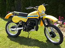 The initial 1977 PE250B proved rugged, well made and docile. The engine was effectively the 5-speed RM series motocross engine, with altered gearing, porting and a heavier flywheel, which produced only 28HP but had broader power and outstanding torque. This proved highly competitive and popular in all countries.[9][10][11]