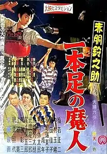 Suzunosuke Akado: The One-Legged Demon (Japanese: 赤胴鈴之助 一本足の魔人, Hepburn: Akadō Suzunosuke: Ippon ashi no majin)[lower-alpha 1] is a 1957 Japanese tokusatsu fantasy drama film directed by Kimiyoshi Yasuda, and written by Tetsuro Yoshida.[2] Produced and distributed by Daiei Film, it is the sixth in the Suzunosuke Akado film series, after Suzunosuke Akado: The Vacuum Slash of Asuka, which was released in the same year on August 25. Suzunosuke Akado: The One-Legged Demon stars Shoji Umewaka, Tamao Nakamura, Yatarō Kurokawa, Eigoro Onoe, and Ryūzaburō Mitsuoka.[3] The film was followed by Suzunosuke Akado: The Birdman with Three Eyes the following year.