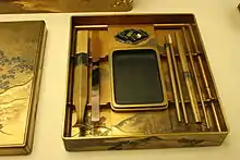 Suzuri-bako (硯箱; "inkstone box") are a type of Japanese writing box. The boxes are traditionally made of lacquered wood and are used to hold writing implements.[1] Historically, the boxes were associated with calligraphy, and as such they were made using high-quality materials designed to safeguard porcelain inkstones (suzuri) from harm.[2]