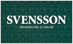 Svensson is a Swedish fashion retailer, based in Malmö. It has its origins in basement clubs in the late 1990s in Möllevången. Gradually the company has grown to include graphic design and journalism, with the establishment of the Svensson Magazine in 2002. In 2005 the brand name Svensson Jeans was created. In 2010 a second store opened in Malmö.[1]