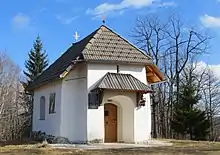 - The Arhar Chapel (Arharjeva kapela) stands above the Arhar farm in the northern part of the settlement. It dates from the mid-19th century and is said to have been built in thanksgiving after a wolf was driven away from the Arhar farm. The altar in the chapel is dedicated to Saint Bernard, and his image on the altar is flanked by statues of Saint Peter to the left and Saint Paul to the right.[6] The chapel was renovated in 1935[6] and again in 2015.[7]