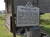 Frederick Swaggerty, a German immigrant, arrived in the Clear Creek area from Pennsylvania sometime around 1783.[5] According to local sources, Swaggerty's son James built the Swaggerty Blockhouse in 1787, presumably to protect his family from hostile Cherokee attacks.[4] If true, this would make the Swaggerty Blockhouse the only surviving blockhouse at its original site in the state of Tennessee.[6]