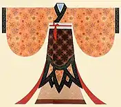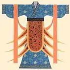 The guiyi can also be divided into 2 styles of clothing based on its cut: i.e. guipao (a form of paofu which is a one-piece robe) and gui chang or gui shu (which follows the ruqun system - upper garment worn with a skirt).[1][4] The clothing was multi-layered and was decorated with an apron-like decorative cloth at the waist with triangular-strips at the bottom and with pieces of ribbons worn underneath the apron which would hung down from the waist.[3] The popularity of ribbons later fell and the decorative hems were eventually enlarged.[3]