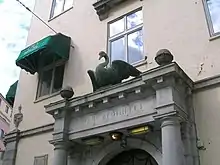 Bergen was a pioneer town where people went to make wealth by fishing or working in the timber or fur industry. The first pharmacist to work there was the Dutchman Lambert Gregerson Friis and he was shortly joined by another Dutch apothecary Nicolas de Freundt who also had no formal training but applied for a permit to Christian IV. The permits was received in December 13, 1595 by Freundt who was given the right to start two pharmacies which were sold some years later but only the Swan pharmacy remained and moved to Danish hands. A second Swan apothecary was opened in Oslo by Dane Baltsar Brabant in 1628.[1] The swan was a symbol of intelligence and purity and was widely used symbols by medieval apothecaries in Finland and Denmark.[2] The building is now a part of the pharmacy chain Apotek 1.